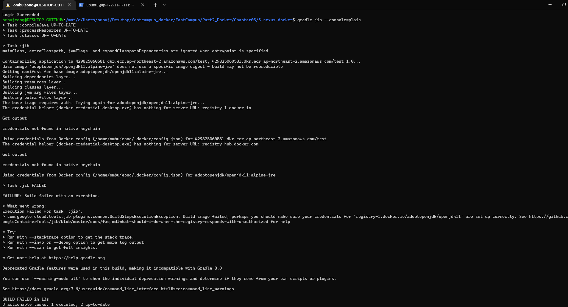 > com.google.cloud.tools.jib.plugins.common.BuildStepsExecutionException: Build image failed, perhaps you should make sure your credentials for '<ecr repository 주소>' are set up correctly. See https://github.com/GoogleContainerTools/jib/blob/master/docs/faq.md#what-should-i-do-when-the-registry-responds-with-unauthorized for help