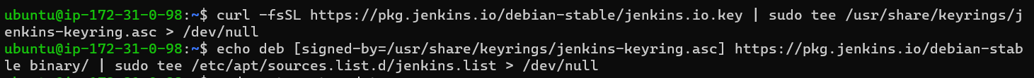 curl -fsSL https://pkg.jenkins.io/debian-stable/jenkins.io.key | sudo tee /usr/share/keyrings/jenkins-keyring.asc > /dev/null