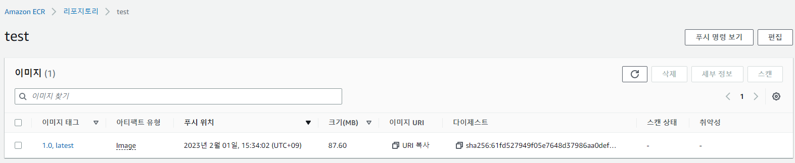 ecr repository에도 이미지 생성이 된걸 확인했다.